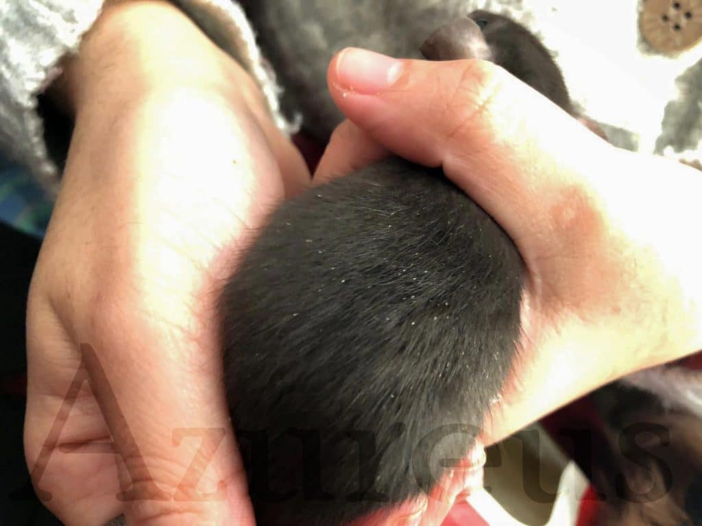 Hace unos días vino Rick a consulta, esta preciosa ratita de casi dos meses, porque los propietarios habían notado que se rascaba mucho y tenía cositas blancas en el pelo. ¡Siendo tan negra se nota muchísimo!