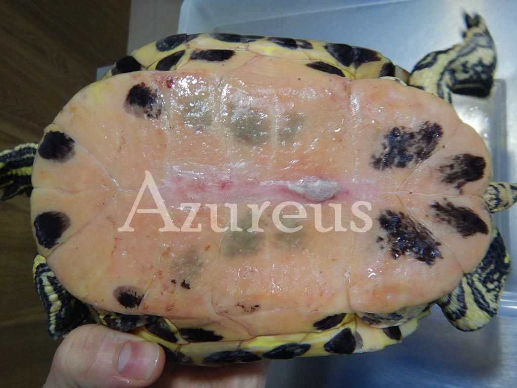 La hibernación, tenerlas por debajo de las temperaturas óptimas y la mala alimentación son factores que predisponen a tener problemas como la tortuga de las fotografías. Nos visitó hace poco en nuestra clínica veterinaria en Cáceres. Y podéis ver que la parte de abajo del caparazón (el plastrón) tiene unas marcas rojas en el centro que no son normales. Además en un punto tiene una infección en el hueso directamente.