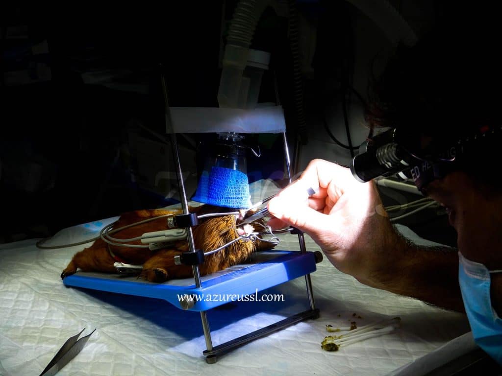 Para poder visualizarlo bien (y arreglar el problema) lo primero es poder ver con detenimiento dónde está «el premio». Y para esto muchas veces, aparte de mirarlo con nuestras cámaras en consulta, hay que sedarlos y ponerlos en un pequeño «potro de tortura». Pero tranquilos, están completamente dormidos, no se enteran de nada (ay! si nosotros viéramos cómo nos colocan para ciertas cirugías en los quirófanos de medicina humana… qué buena es la anestesia que hace que no nos enteremos de ná 🙂 ).