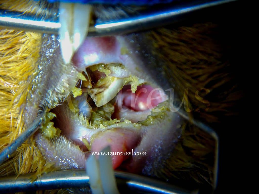Es por ello que recomendamos siempre ver a las cobayitas mínimo una vez al año para valorar sus dientes, y lo preferible es verlos cada 6 meses. Para detectar estos problemas cuando son pequeños y ponerles remedio antes de que vayan a más (como en el caso de la fotografía).