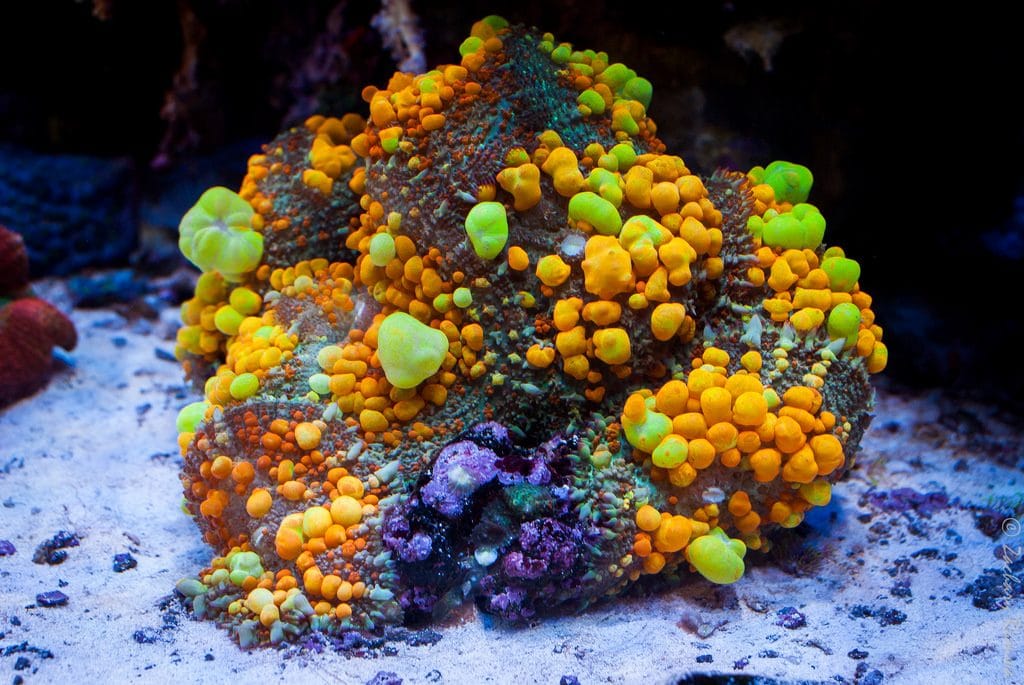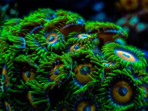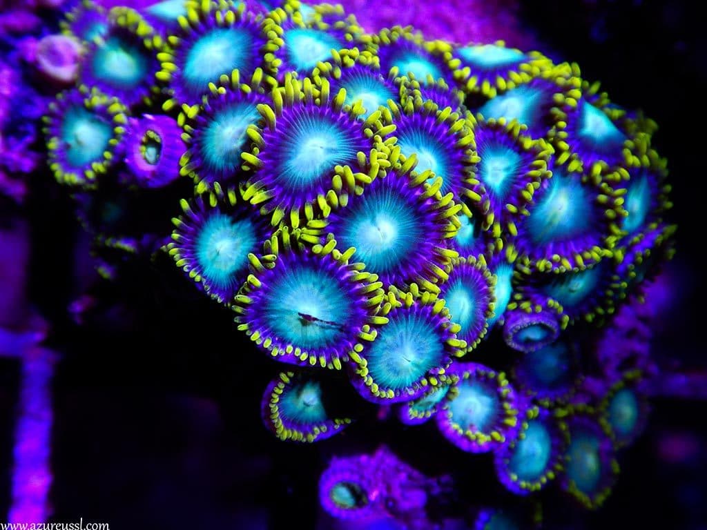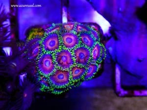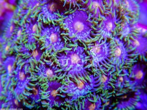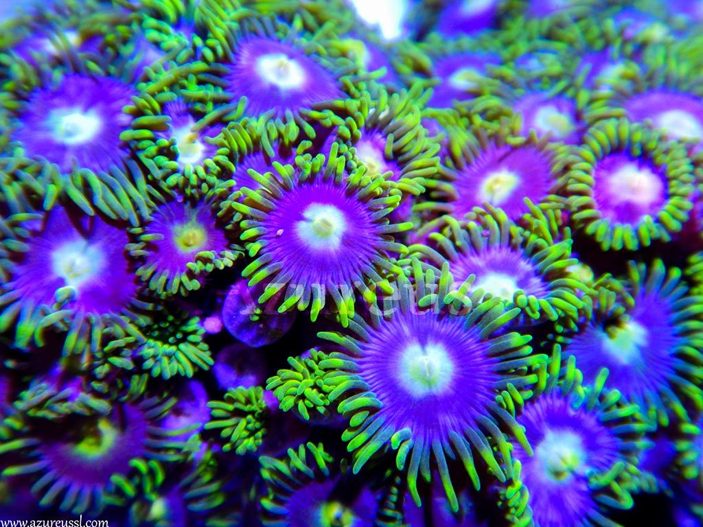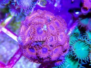 Un coral clásico de cualquier acuario. Los zoanthus son corales que van creciendo sobre las superficies del acuario, ya sea sobre rocas o sobre el propio cristal del acuario. Sus pequeños pólipos se van extendiendo poco a poco y forman auténticos mantos. Como cualquier coral blando, puede resultar invasivo una vez instaurado en el acuario y de vez en cuando es necesario controlar su población, sobre todo si comienza a crecer sobre otros corales.