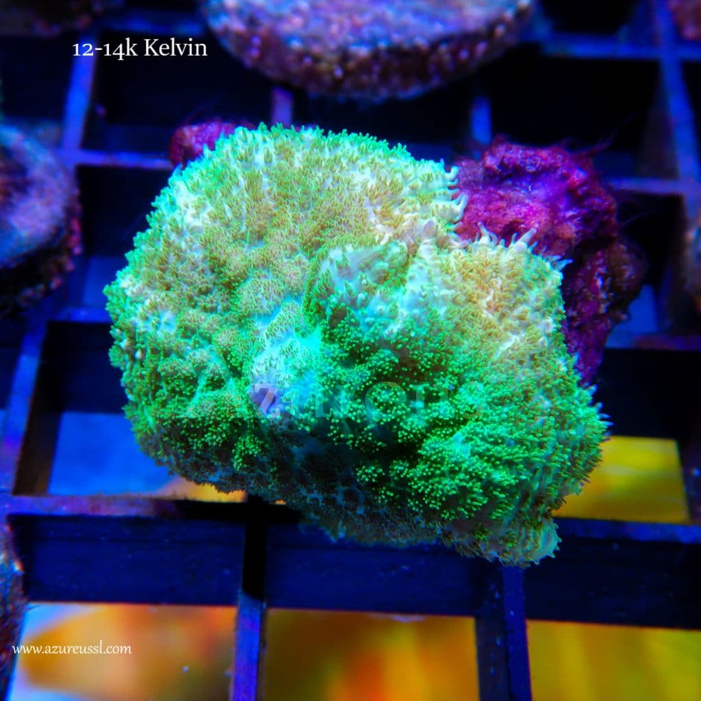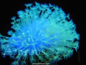 Cada vez se consiguen variedades nuevas de color de colores más variados y más fluorescentes. El de la fotografía es un esqueje de Sarcophyton que criamos en Azureus y tiene un color verde claro fluorescente impresionante.