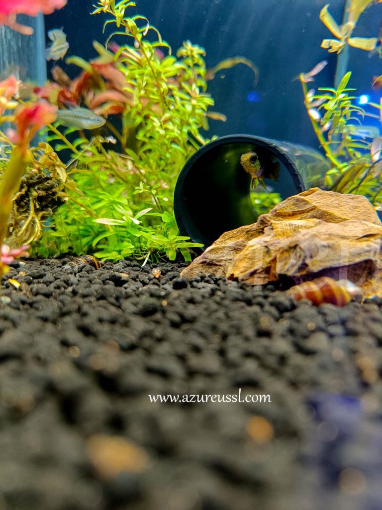 En la foto podéis ver una hembra de Apistogramma agassizi preciosa que está cobijándose en una tubería de PVC negra (que son más estéticas, la verdad sea dicha) porque el macho está… digamos… demasiado hormonado y no la deja en paz ni a sol ni a sombra.