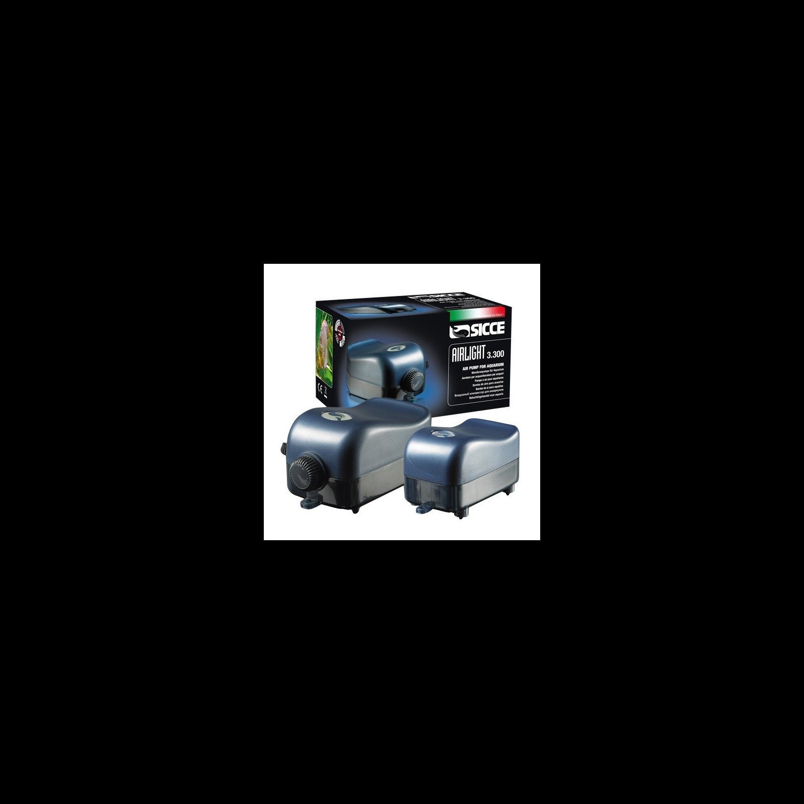 Compresor de aire regulable de la marca Sicce. Caudal máximo 200 litros / hora. Dos salidas.